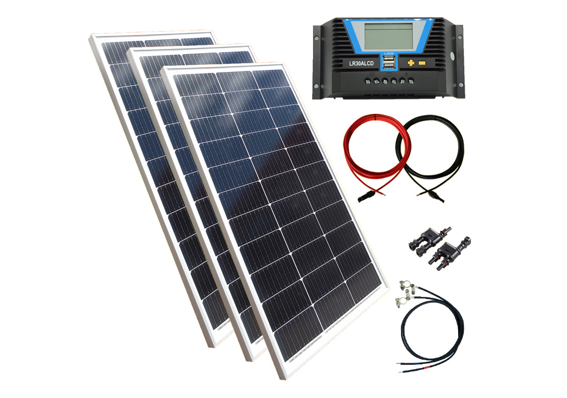 Diese Anlage besteht aus drei Solarmodulen mit einer Gesamtleistung von 390 Watt, einem Solarladeregler und wahlweiser einer Batterie und/oder einem Spannungswandler.