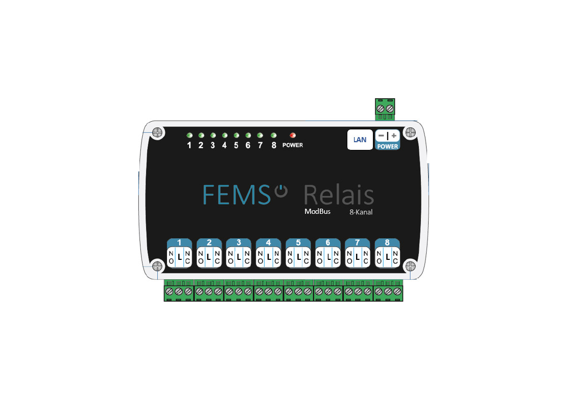 Das Fenecon FEMS Relais 8-Kanal TCP ist ein Gerät, mit dem Sie acht externe Geräte über digitale Signale in einem TCP/IP-Netzwerk steuern können. Hier sind die wichtigsten Funktionen: