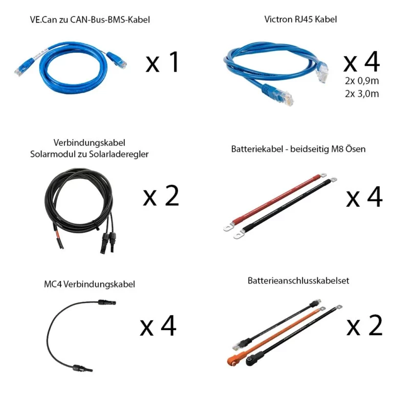 Neben der Leistungselektronik, dem Speicher und den Solarmodulen gehören sämtliche für den Anschluss benötigten Komponenten ebenfalls zum Lieferumfang, mit Ausnahme der Solarmodulhalter, welche separat bestellt werden muss. Alle übrigen Komponenten sind Plug and Play – das bedeutet keine lästige Steckermontage oder dergleichen – anschließen und fertig.