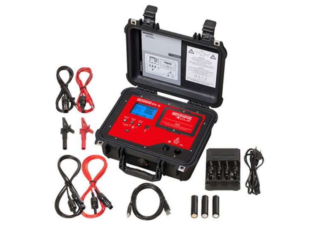 Im Rahmen der Inbetriebnahme- und Wiederholungsprüfung von netzgekoppelten Photovoltaik-Systemen gemäß VDE 0126-23 (DIN EN 62446), können Polaritätsprüfungen, Leerlaufspannungs- und Kurzschlussstrommessungen von parallelgeschalteten PV-Strängen sicher und effizient bis 1500 V/40 A durchgeführt, gespeichert und dokumentiert werden.